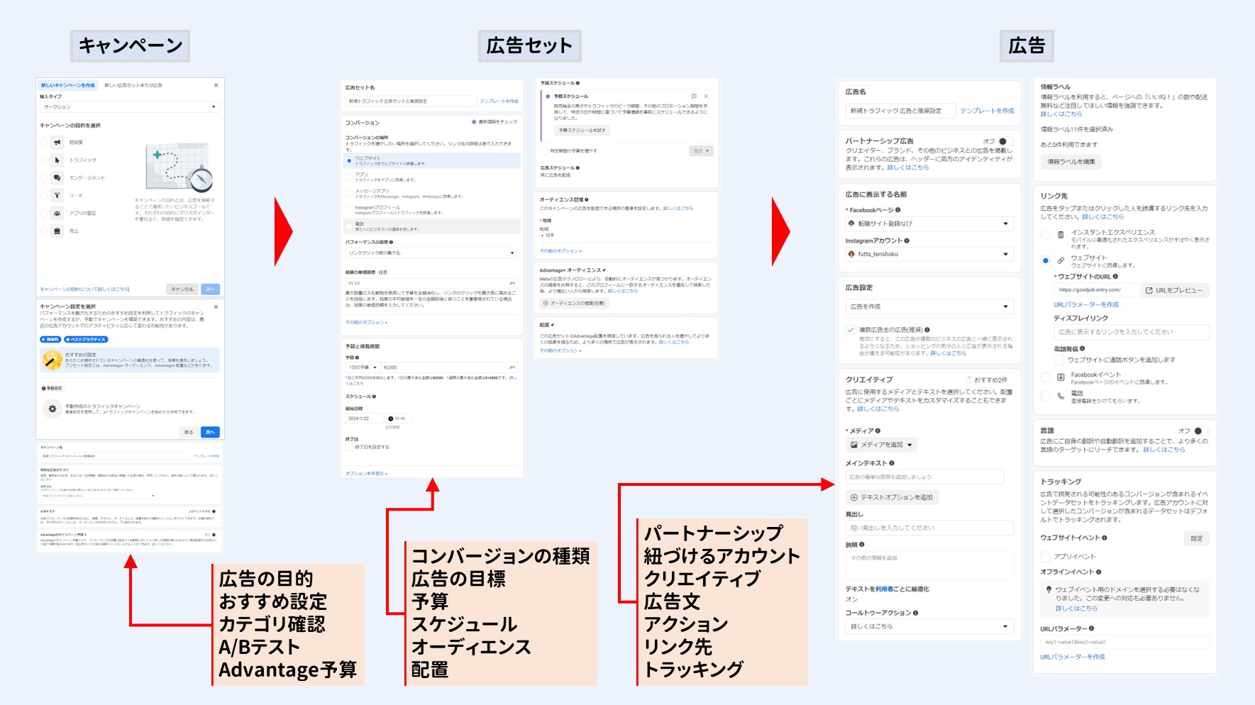 広告を新規で作成する場合、「キャンペーン」→「広告セット」→「広告」の順に設定していきます。