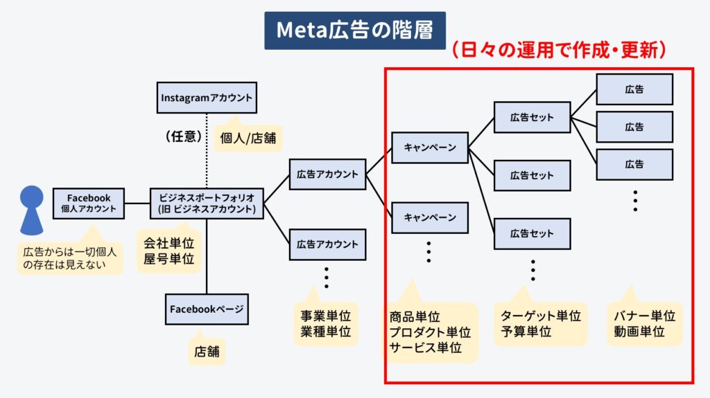 日々の広告運用では右側のキャンペーン以降の階層を作成・更新していきます。